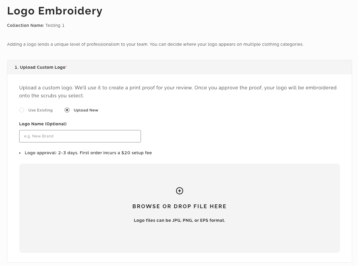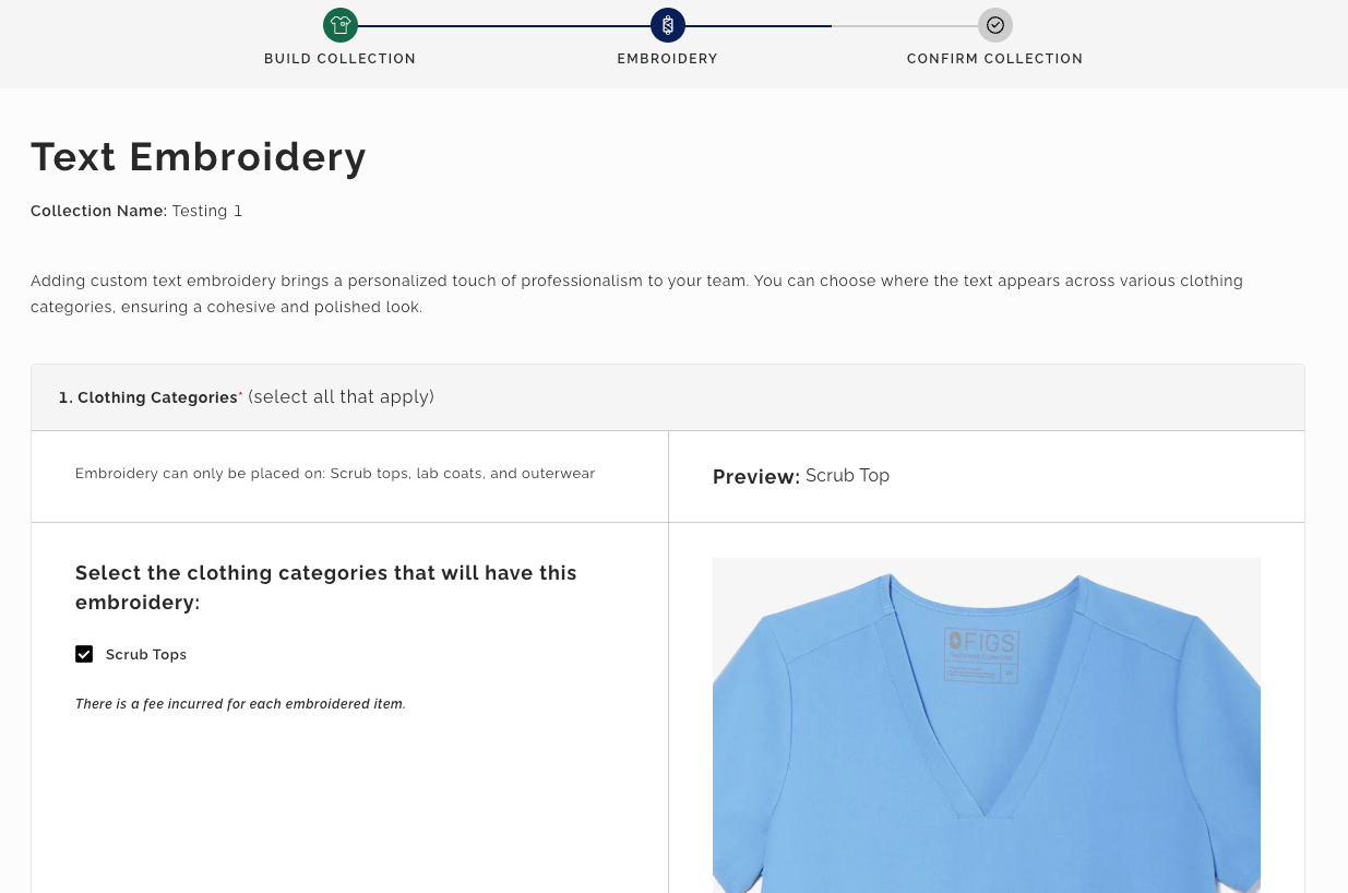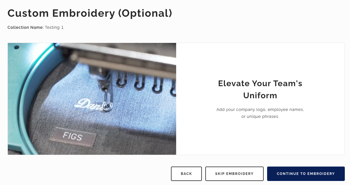 💡Tip: To skip logo or text embroidery, leave that page blank and click Skip Embroidery → Skip this Step.